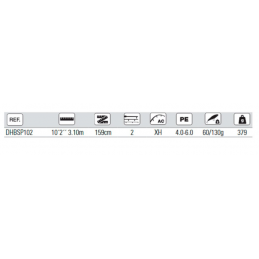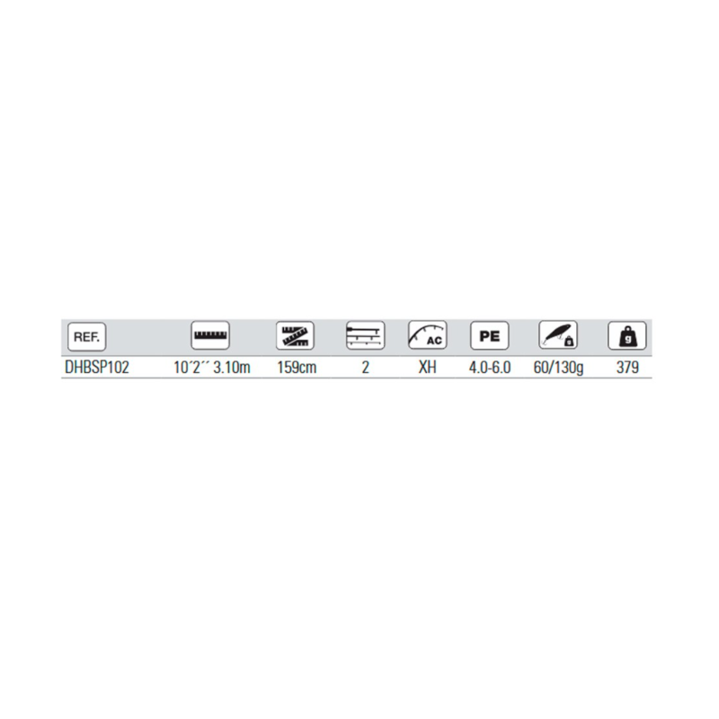 Longitud: 2,30 m Peso: 98 g Peso del señuelo recomendado: 3–15 g Puntera: tubular Blank: carbono tubular, acción rápida (Fast Action) Línea recomendada: PE 0.3–1.2