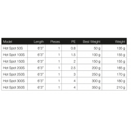 La serie Hot Spot es un conjunto de cañas diseñadas para la pesca Slow Jigging. Son cañas de alta calidad con los mejores componentes Fuji. Toda la serie HOT SPOT S incorpora anillas monopie Fuji SIC y portacarretes fijo. Estas cañas son extremadamente ligeras y a la vez muy potentes.