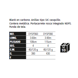 Longitud 3 metros Secciones 5+3 Peso 255gr Accion 20-180gr Longitud 4metros Secciones 6+3 Peso 360gr Accion 20-180gr
