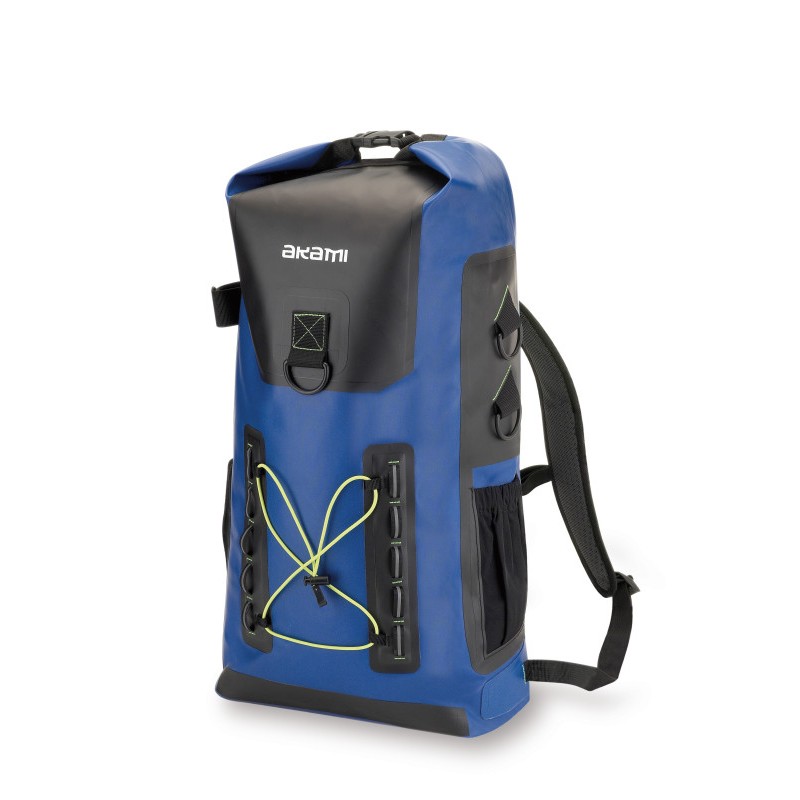 Mochila de material hidrofóbico confortable de cremalleras autoselladas. Equipada con bolsillos estancos al agua con cierre de seguridad.