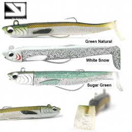 Jig plomado montado con un assist en la parte delantera y un triple en la trasera. Gracias a las formas rectas del cuerpo, se comporta de forma errática al profundizar, pero siempre manteniendo una posición horizontal. En el momento de empezar a trabajar la caña se mueve de izquierda a derecha obedeciendo los tirones que recibe. Tamaño 75mm Peso 30 gr
