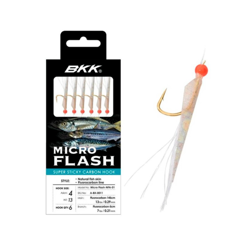Sabikis de alta calidad montados con fluorocarbono, tanto la línea madre como los 6 brazos. Piel de pez natural en 3 acabados diferentes, natural, blanca y rosa. Longitud total 145 cm y brazos de 5 cm con anzuelo dorado de alto brillo.